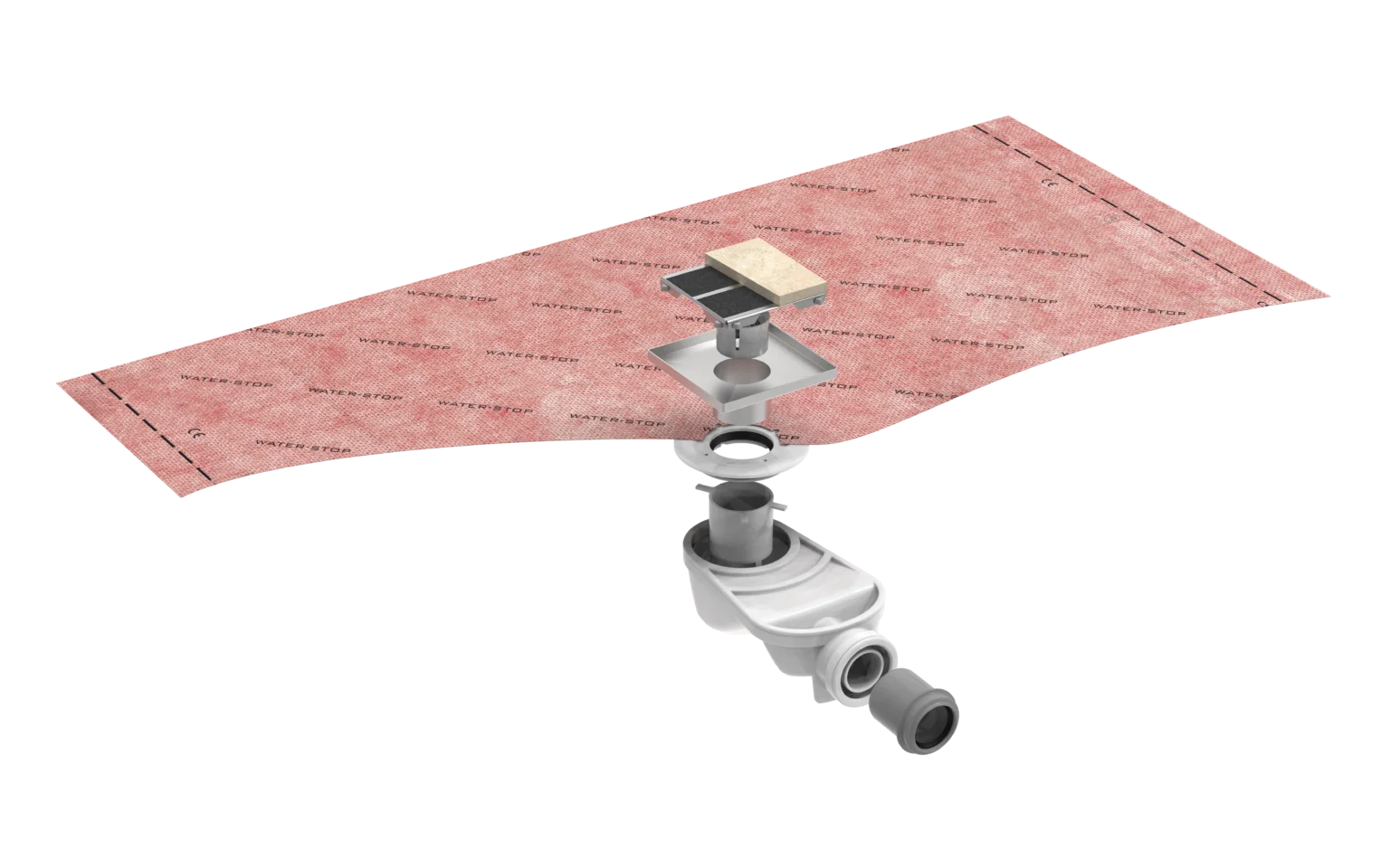 Esta compuesto por una pieza de lámina impermeable unida y sellada en fábrica a un manguito adaptador especial para recibir una cazoleta de acero inoxidable y para su conexión al cuerpo sifónico del sumidero